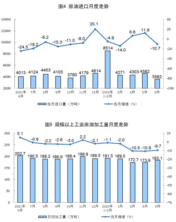 原油生產(chǎn)穩(wěn)定增長(zhǎng),進(jìn)口由升轉(zhuǎn)降。6月份,生產(chǎn)原油1719萬(wàn)噸,同比增長(zhǎng)3.6%,增速與上月持平,日均產(chǎn)量57.3萬(wàn)噸。進(jìn)口原油3582萬(wàn)噸,同比下降10.7%,上月為增長(zhǎng)11.9%。
