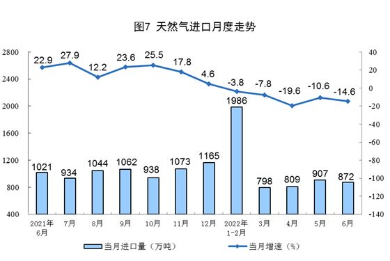 天然氣生產(chǎn)增速放緩,進(jìn)口降幅擴(kuò)大。6月份,生產(chǎn)天然氣173億立方米,同比增長(zhǎng)0.4%,增速比上月放緩4.5個(gè)百分點(diǎn),日均產(chǎn)量5.8億立方米。進(jìn)口天然氣872萬(wàn)噸,同比下降14.6%,降幅比上月擴(kuò)大4.0個(gè)百分點(diǎn)。
